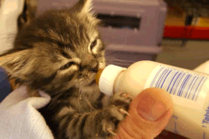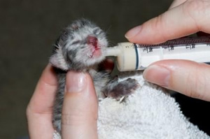 Durante los primeros días podemos suministrar el alimento al gatito mediante una jeringuilla o un biberón con una tetina muy pequeña para más adelante seguir con un biberón con tetina normal. La leche ya hemos comentado que sólo debe ser la indicada para gatos y debe tener una temperatura de 38ºC. Las tomas deberemos realizarlas cada dos horas aproximadamente durante los primeros días y cada 4 cuando el animal haya ganado un poco de peso. Este punto es muy importante para que el animal pueda sobrevivir y no muera de inanición por lo que vale mucho la pena dejarse aconsejar por un veterinario.