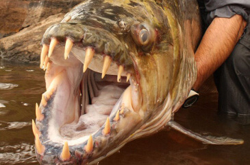 El pez tigre goliat (Hydrocynus vittatus o Hydrocynus goliath) ya advierte por el nombre cuál es su principal característica.