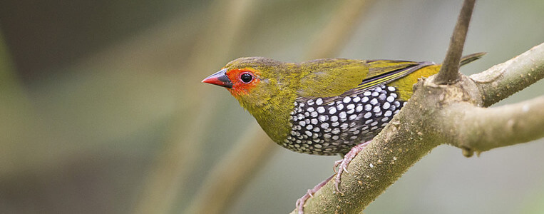 Aunque el bengalí verde moteado es un ave muy pequeña necesita mucho espacio, sobre todo si lo que se quiere es la reproducción, ya que necesitan privacidad. Se pueden alojar en parejas o en grupos, aunque no se recomienda que haya más de dos pares.
