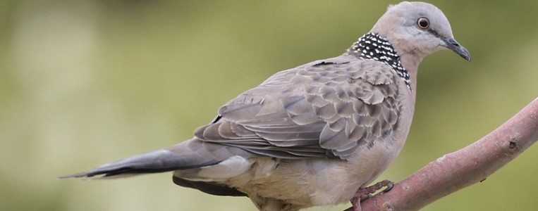 La tórtola china pesa alrededore de 130 gramos y no mide más de treinta centímetros. Los colores de esta paloma larga y esbelta son los rosados con pequeñas motas grises en la cabeza y en el vientre. Es característico de esta especie que, alrededor del cuello, las plumas son negras y hace que parezca que lleva un collar. Las plumas de las alas son de colores beige.