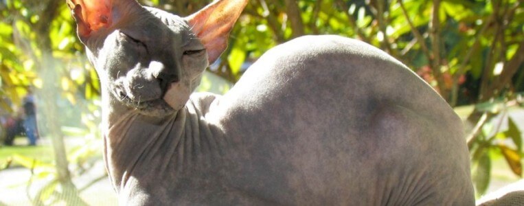 Respecto a sus cuidados por paradójico que parezca requiere un cepillado suave regular. Su metabolismo es más alto que los gatos con pelo por lo que requieren una alimentación suplementaria mayor que otros peludos de tamaño similar. No necesita de un baño regular puesto que su piel es seca por lo que bastará asearlo una vez a la semana con toallitas húmedas. Asimismo debe ser protegido de lugares de temperaturas extremas, así como de una intensa exposición al sol que le podría causar importantes quemaduras en su piel desprotegida de manto. Téngase en cuenta que su piel reacciona como la nuestra: sus partes pigmentadas suelen oscurecerse ante la exposición.