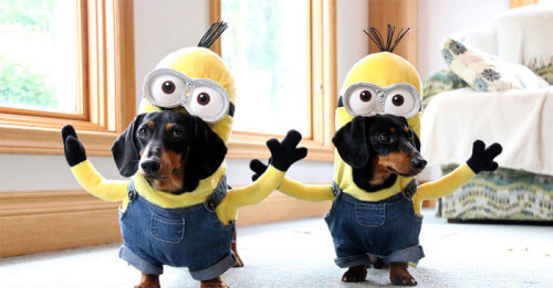 Al dueño de estos encantadores perros salchicha, se le ocurrió para celebrar la publicación de un libro que ha editado, donde los protagonistas son sus dos perros salchicha recorriendo lugares del mundo, crear dos disfraces para ellos y vestirlos así de Minions.